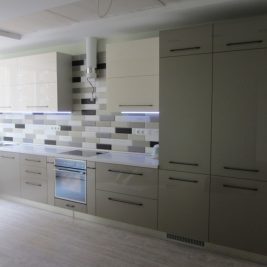 Двухрядная планировка. Все шкафы и полочки размещены вдоль обеих стен. Отлично выглядит в кухне, приближенной к форме квадрата или легкого прямоугольника. При оборудовании этой кухни обязательно оставьте свободный проход между рядами параллельно расположенных шкафов, минимум – 1,2 метра.
