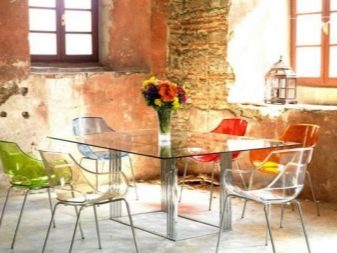 Особенностью этого вида мебели является полная или частичная прозрачность, благодаря чему создается необычный эффект. Например: если поменять массивные изделия на прозрачные аналоги, интерьер приобретет легкость.