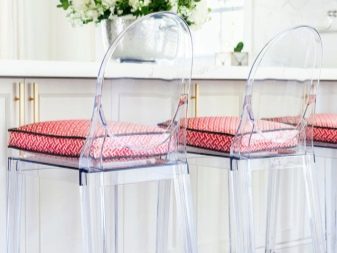 Прозрачные стулья смотрятся необычно. Они украшают кухню, позволяют визуально увеличить пространство, хорошо отражают искусственный или дневной свет. Благодаря этому, кухня выглядит чище, светлее, комфортнее. Такие конструкции хорошо смотрятся в маленькой кухне и большой столовой.