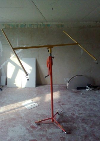 В некоторых случаях применяется подъёмник-распорка. Он представляет собой конструкцию, состоящую из двух телескопических труб, штока для подъёма, а также зажима и упоров из обрезиненного полимера. Для отключения фиксации штока оборудование оснащено рычагом. Распорка позволяет удерживать гипсокартонные плиты вертикально. Из плюсов сооружения можно выделить малый вес, подвижное основание, возможность работы со стенами и потолками.