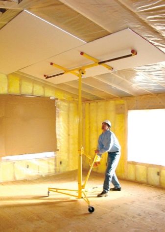 Приспособление поднимает к потолку и фиксирует на месте будущего монтажа листы гипсокартона, некоторые модели также способны транспортировки ГКЛ в конкретную точку. При использовании устройства монтажник лишь прикручивает лист саморезами, значительных усилий для работы прикладывать не нужно, не потребуется и приглашение помощников. Современные модели оснащены нивелиром или строительным уровнем и потому предоставляют возможность устанавливать листы без дополнительного контроля;