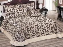 - Стеганые покрывала изготавливаются путем сшивания 3-х разных шаров: лицевого -жаккардового, внутреннего наполнителя – синтепона, изнаночного – сатина либо полиэстера. Края такого покрытия обычно имеют окантовку или рюши. Стеганые покрывала можно узнать по геометрическим простежкам, выполняемых нитями, совпадающими по цвету к основному материалу. Такие полотна могут выполнять функции защитной накидки для кровати или летнего одеяла.