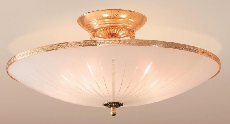- Люстра припотолочная или на штанге в форме перевернутой тарелки. Эта модель может быть выполнена из недорогих материалов, в таком случае люстра будет весьма доступной. Форма позволяет удачно рассеять свет по комнате и сэкономить место.