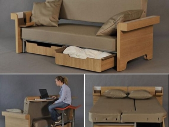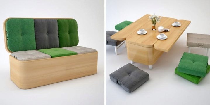 Данный вариант может объединять не только две, но и даже четыре полезные вещи. Вы сможете приобрести оригинальный диван со столиком, который будет удачно вписываться в ваш интерьер. Для изготовления такой мебели применяют текстиль, фанеру или пластик. Вы сможете проявить свою фантазию и при желании переставить модули. Так вы получите уже совсем другую композицию, которая будет способна создавать самую разную мебель.