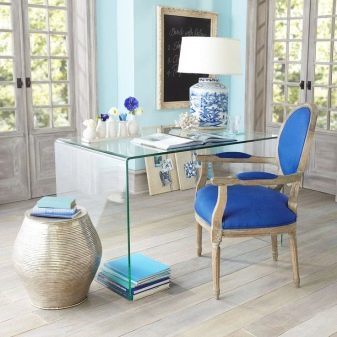 Если есть желание сделать кабинет необычным, легким и воздушным, то лучше всего с этой задачей справится стеклянный стол. Очень подойдет такой вид мебели для женского рабочего места. Особенно хорошо впишется стеклянная рабочая зона в комнату в минималистическом стиле и современный хай-тек. Из минусов можно выделить неустойчивость покрытия к постоянному использованию, на нем начнут появляться потертости и царапины.