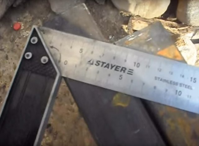 3. С каждого края полосы угольником проводятся линии под углом в 45°, а затем по ним делается срез с помощью болгарки. Для улучшения прочности сварных швов места среза тщательно зачищаются до чистого металла.